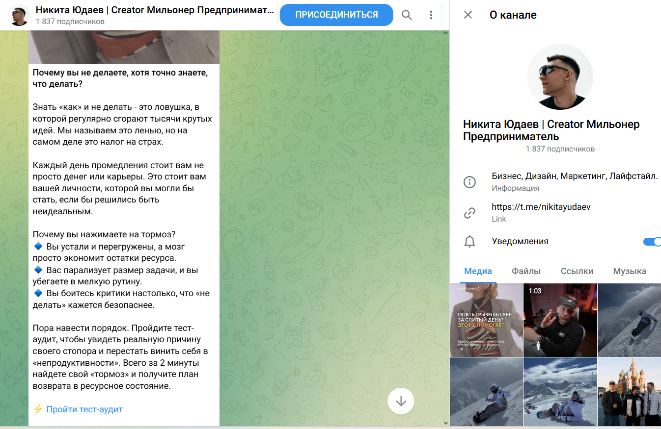 У Никиты также есть отдельный Телеграмм-канал Nikitayudaev, у которого 1.8 тыс. подписчиков.