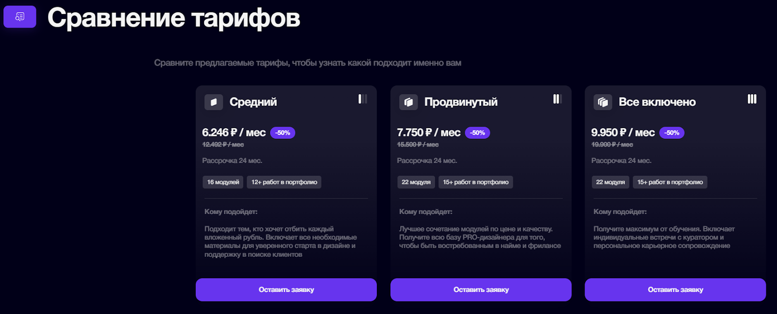 - “Средний”. Доступно 16 модулей, каждый ученик получает по 12 работ в портфолио. изучается юридическая сторона, маркетинг, реклама и прочее. Стоимость 6 246 рублей в месяц по скидке;