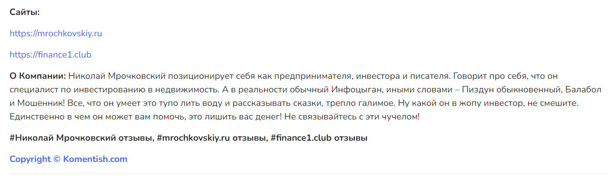 В интернете есть негативные отзывы, разоблачения, даже жалобы на деятельность Николая Мрочковского. Их авторы жалеют, что зря потратили время и деньги, поверив репутации этого финансиста. Они настойчиво предостерегают других пользователей от того, чтобы связываться с этим инфо-цыганом.