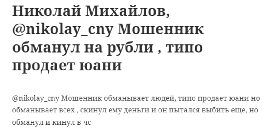 В отзывах многие предупреждают других не попадаться на уловки обменника Nikolay Cny. Клиенты подчеркивают, что данный сервис не заслуживает доверия. Предложения обменника являются классическим примером финансового мошенничества. Помимо этого, жертвы сталкиваются с серьезными финансовыми трудностями: