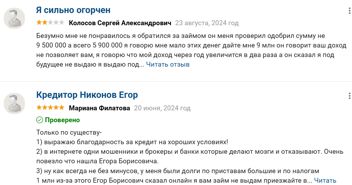 На некоторых площадках инвестор Никонов Егор Борисович отзывы получил преимущественно положительные. Это выглядит очень подозрительно, так как люди составляют непривычно развернутые комментарии со своими историями получения денег. Все это не выглядит похожим на правду. Они также часто оставляют контактные данные для связи с инвестором, так как иными способами найти такого известного человека с выгодными предложениями будет практически невозможно. Даже небольшое количество негативных отзывов показывает Егора Борисовича только со справедливой и хорошей стороны.