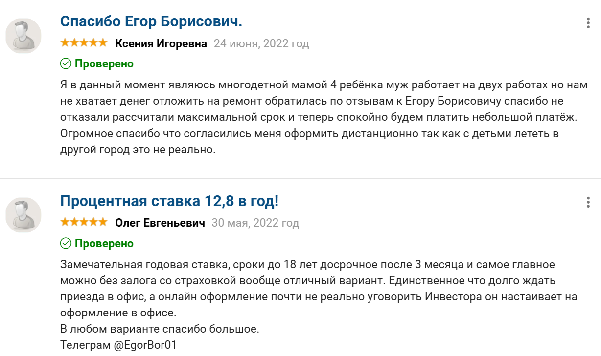 Никонов Егор Борисович якобы предоставляет деньги под 10,3%-13,7% годовых. Это помогает ему получать прибыль, а интересующимся займами вкладывать в свой бизнес, гасить другие кредиты и избавляться от долгов. Все выглядит так, будто сделана схема для новичков, нуждающихся в деньгах и не сильно разбирающихся в юридической стороне вопроса. В Екатеринбурге, где проживает данный инвестор, якобы можно получить деньги без залога и предоплат, но если оформлять оплату дистанционно, то потребуется вносить средства на счет инвестора.Схема, по которой действует инвестор Никонов Егор Борисович, очень похожа на мошенническую. В таком случае у пользователей практически нет ни каких контактов, кроме номера телефона, почты или Телеграма данного лица. Они не видятся в живую. Но при желании получить выгодные условия о таких мелочах забывают. Для получения крупной суммы на долгий срок от них требуют внести оплату за оформление или другие цели. После оплаты инвестор часто исчезает. Поэтому он специально рассчитывает на людей, которые живут не в его городе и не будут приезжать.