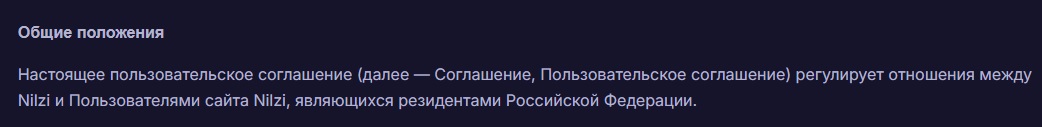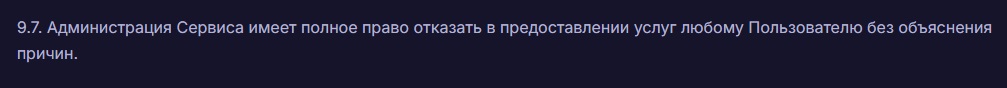 Единственным документом, содержащим хоть какую-то информацию о проекте Nilzi, является пользовательское соглашение. При этом во время его изучения было обнаружено огромное количество моментов, лишающих пользователей каких-либо гарантий безопасности. Во-первых, администрация сервиса прямо говорит о том, что имеет право расторгнуть договор в любой момент без всяких причин. При этом объяснять пользователю такое решение обменник не будет.