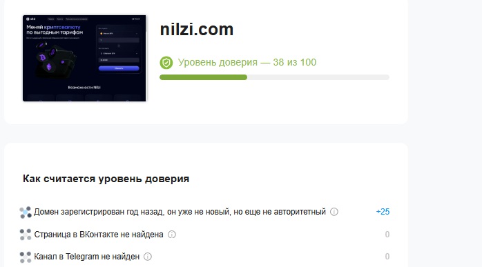 Стоит отметить, что даже выкуп домена у другой компании не смог улучшить репутацию обменника. После анализа доменного имени с помощью сервиса, занимающегося оценкой рейтинга доверия, стало понятно, что сайт имеет всего 38 баллов из 100 возможных. Столь низкий показатель обусловлен отсутствием какой-либо информации. Сервис не смог обнаружить даже социальные сети, принадлежавшие проекту.