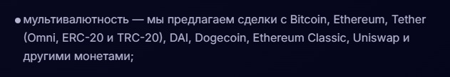 Одним из своих главных преимуществ площадка считает мультивалютность. В качестве инструментов для обмена сервис предлагает весь список популярных цифровых активов: от Биткоина до Тезера.