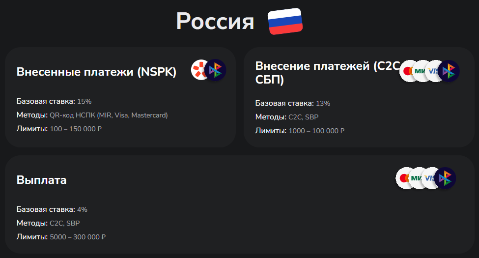 В России прием платежей через QR-код НСПК обойдется в 15%. Через C2C переводы и СБП чуть дешевле – 13%. Для мелких платежей до 1000 рублей ставка выше – 16%. На выплаты комиссия составляет 4%. Лимиты на прием до 150 тысяч рублей.