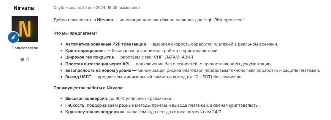 Nirvana Pay – это платежная система для приема и вывода денег в high-risk нишах. Сервис создан под гемблинг, букмекерские ставки, бинарные опционы и онлайн-торговлю. Проекту уже больше года, но в сети нет ни одного отзыва. Ни положительных, ни отрицательных. Это сразу вызывает вопросы. В обзоре разберем условия работы, тарифы по странам и попробуем понять, можно ли доверять этому сервису.