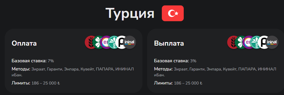 Для Турции ставка на прием составляет 7%, на выплату всего 3%. Доступны Ziraat, Garanti, Enpara, Papara и другие банки. Проводить можно от 186 до 25 тысяч лир.