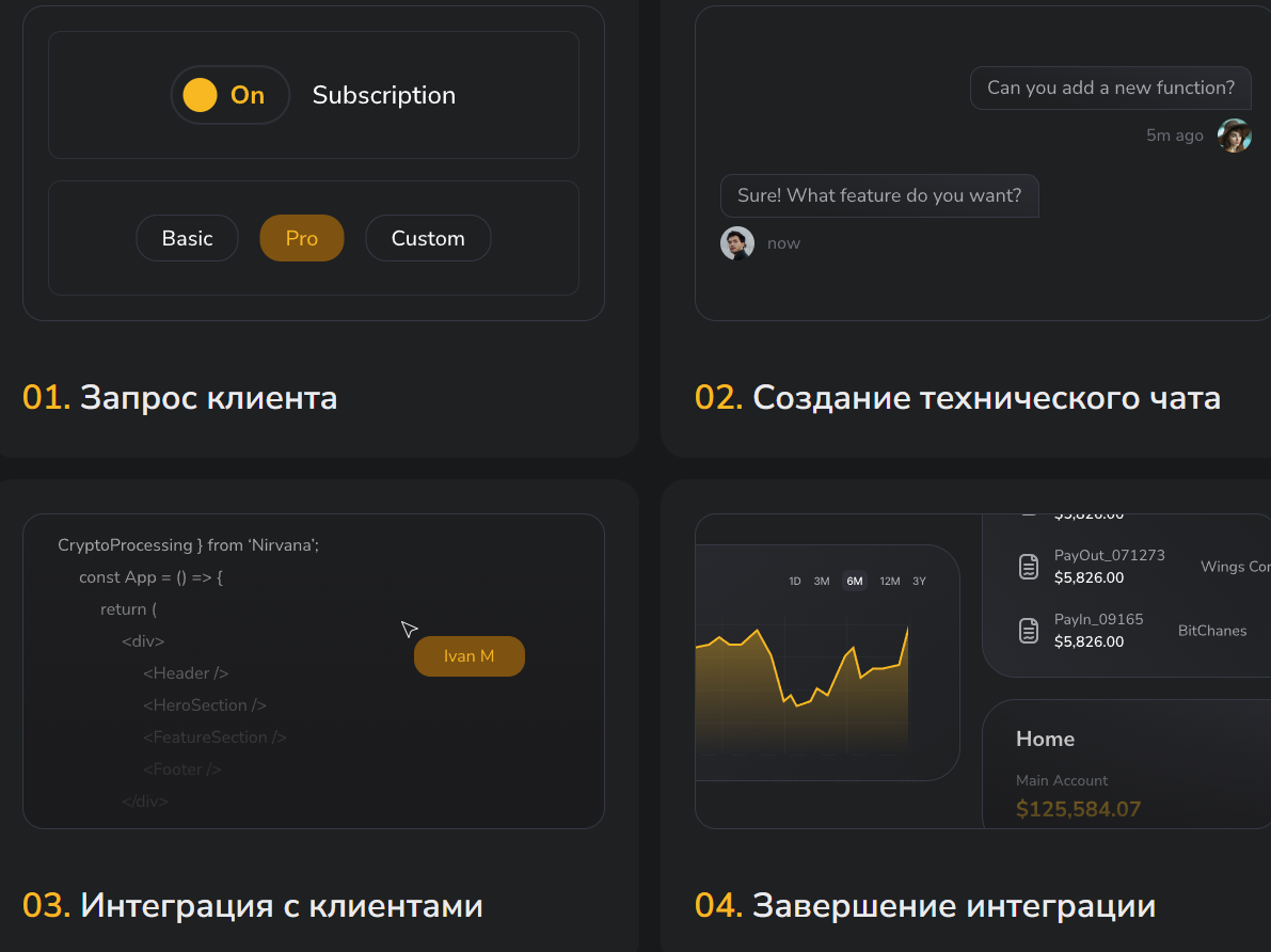 Подключение к Nirvana Pay происходит через API или редирект на готовую форму оплаты Payform. Команда обещает провести интеграцию за сутки или даже быстрее. Для работы создается технический чат в Телеграме. Там решают все вопросы по настройке и запуску.