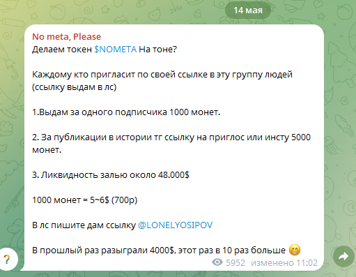 14 мая 2025 года автор завил о том, что планирует запустить токен NOMETA на TON. Пользователям он сал предлагать выполнять задания, чтобы получать будущие монеты. Для сотрудничества необходимо написать на аккаунт менеджера @lonelyosipov, а он выдаст реферальную ссылку для приглашения пользователей. Якобы за 1 подписчика дадут 1000 монет, что по заявлениям автора, будет эквивалентно 5-6 USD. Разумеется, никаких подтверждений этому нет.