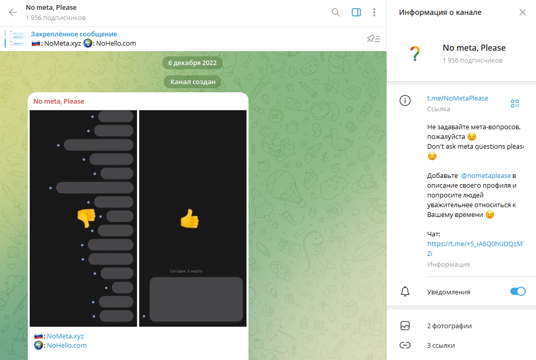 Данный Тг-канал выглядит загадочно, а его назначение не до конца понятно. Изначально на нем было только два поста, связанных с негативным отношением к так называемым мета-вопросам. При этом они сопровождаются ссылкой на сайты с той же тематикой.