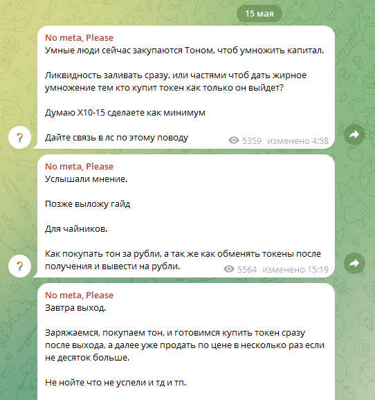 15 мая на канале было сообщение о том, что якобы запуск токена будет уже на следующий день и с ним можно сделать как минимум 10-15 иксов. Подтверждений этому нет. И в целом неизвестно, имеет ли анонимный автор хоть какой-то опыт в крипте.