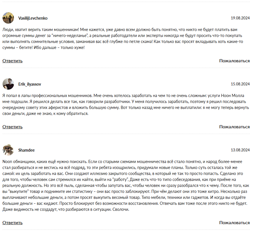 Негативные отзывы о Noon Mall содержат информацию о блокировке аккаунта на сайте, игнорировании запросов службой поддержки. Партнера обвиняют в совершении ошибки при проведении обратного выкупа и не возвращают потраченные деньги, не говоря уже о выплатах процентов.