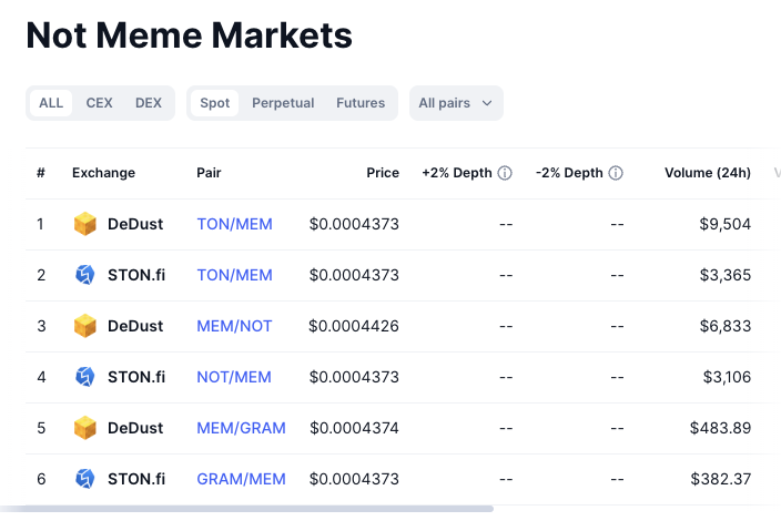 Держателям «Нот Меме» перед выводом следует обязательно позаботиться о выборе биржи, на которой наблюдается наиболее высокий оборот. Иначе для конвертации может просто не хватить ликвидности. Это связано с тем, что суточный объем торговли Not Meme является очень скромным.