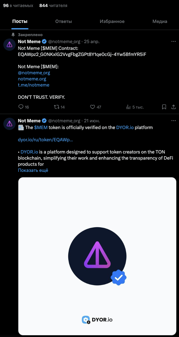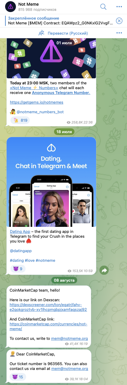 Главный информационный источник проекта – это telegram-канал Not Meme. На него, на 19 августа 2024-го года, подписано около 816 тысяч пользователей.