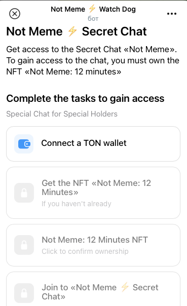 Еще в Телеграмм у проекта есть бот – Not Meme Watch dog Bot. Он предназначен для раздачи доступов в секретный чат проекта. А чтобы воспользоваться соответствующей возможностью, требуется вначале купить NFT Not Meme Ton.