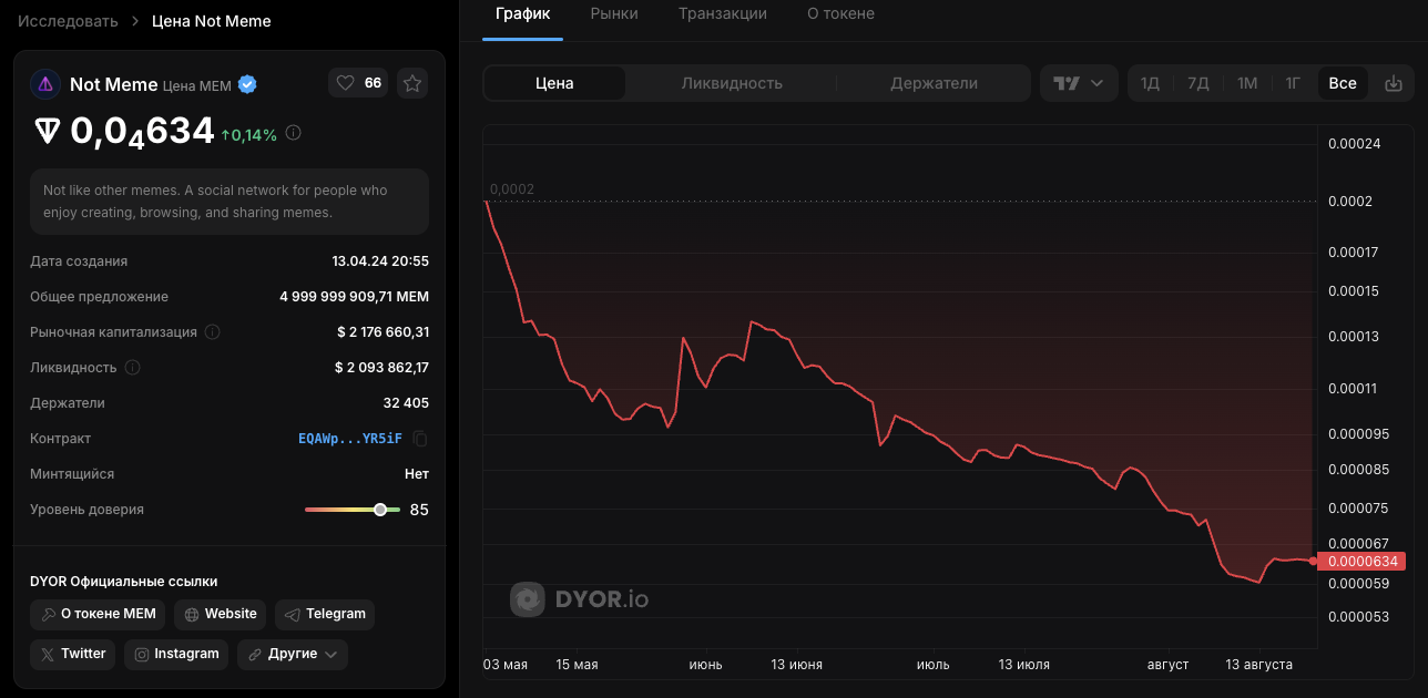 Когда произошел листинг монеты NotMeme, ее цена была значительно выше текущей. Так, за 3 месяца существования монетки цена «Нот Меме» снизилась почти в 50 раз.