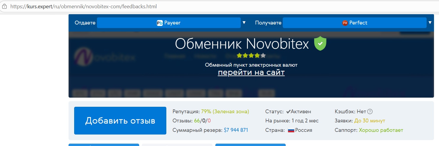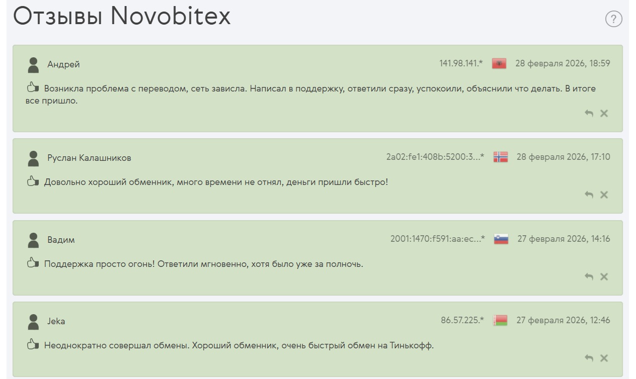 В сети преобладают положительные отзывы о работе Novobitex, в которых пользователи хвалят площадку за скорость проведения транзакций и качество обратной связи. Обещания разработчиков о быстром обмене подтверждаются на практике. Клиенты пишут, что деньги приходят на счет оперативно, а заявленные в преимуществах лояльные курсы соответствуют реальности.