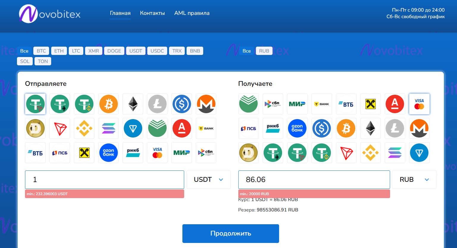 Основной площадкой проекта стал сайт novobitex.com. Именно здесь проходят все операции. Интерфейс выглядит просто и не перегружен лишними деталями. Пользователям сразу предлагают форму обмена с выбором популярных активов, таких как Bitcoin, Tether и разные банковские направления. Лишнего контента тут нет: ни обучающих статей, ни сложной аналитики — всё только по делу.