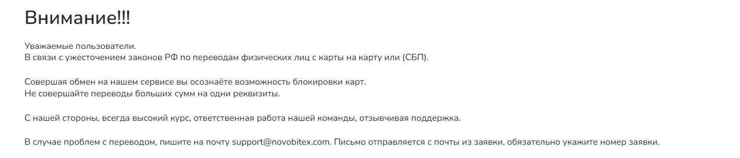 Наше мнение: Novobitex — подходящий вариант для быстрых обменов, если вы понимаете специфику рынка. Сервис удобен для повседневных операций, хотя и работает исключительно на доверии.