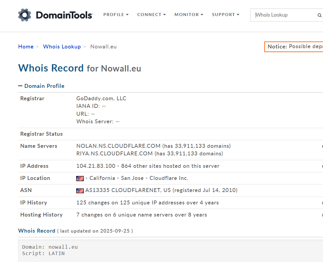 Во время проверки мы обнаружили клоновый сайт на домене nowall eu с закрытыми регистрационными данными и частой сменой IP/NS, тогда как основной домен nowall ru зарегистрирован 29 декабря 2016 г. и хостится в России.
