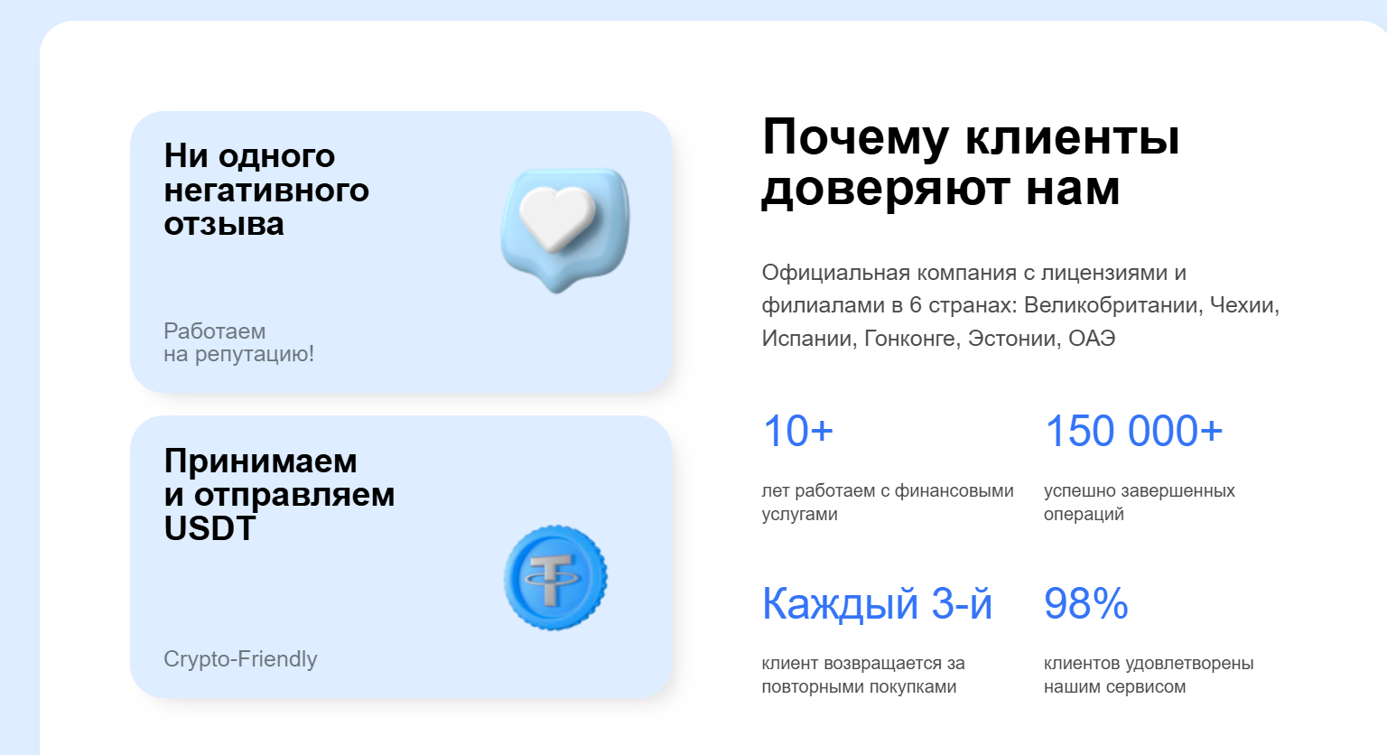 • Маркетинговые цифры: 150К+ операций, 98% довольных клиентов, которые не подтверждены сторонними источниками.