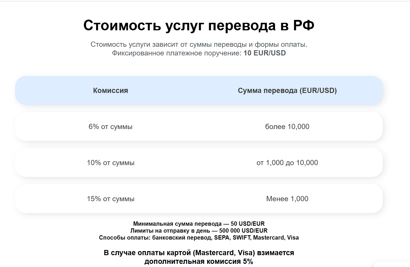 • Высокие комиссии на мелкие переводы: 15% при сумме до 1К USD/EUR, при оплате картой добавляется +5%.
