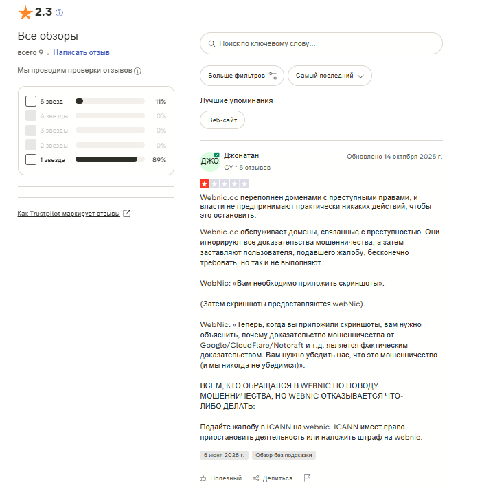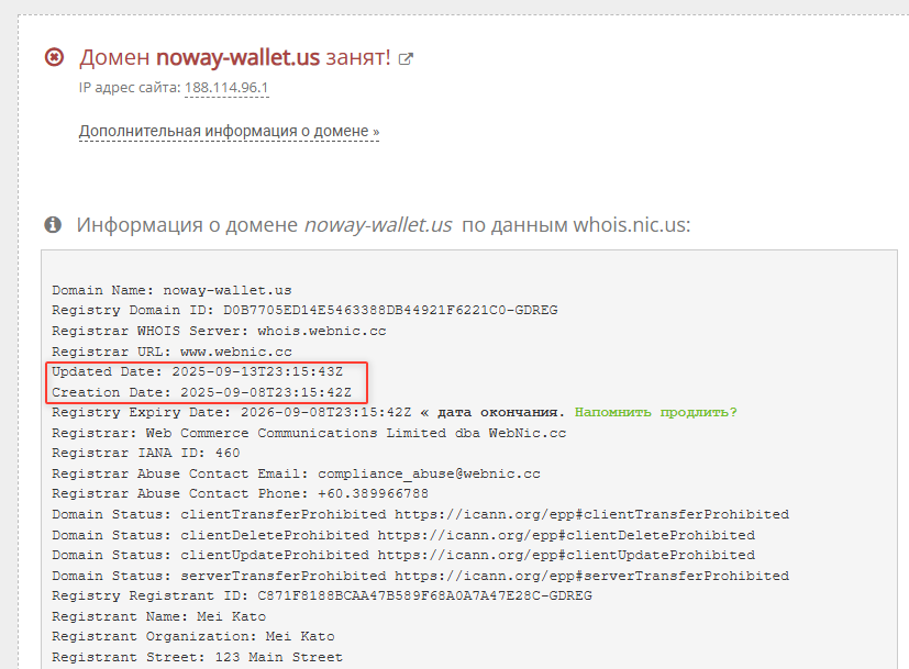 Мы проверили адрес и узнали, что он был создан в сентябре 2025 года, поэтому можно судить о «молодом» возрасте организации. Нет информации о том, кому конкретно принадлежит этот адрес, но мы нашли упоминание о регистраторе – компании Webnic cc.