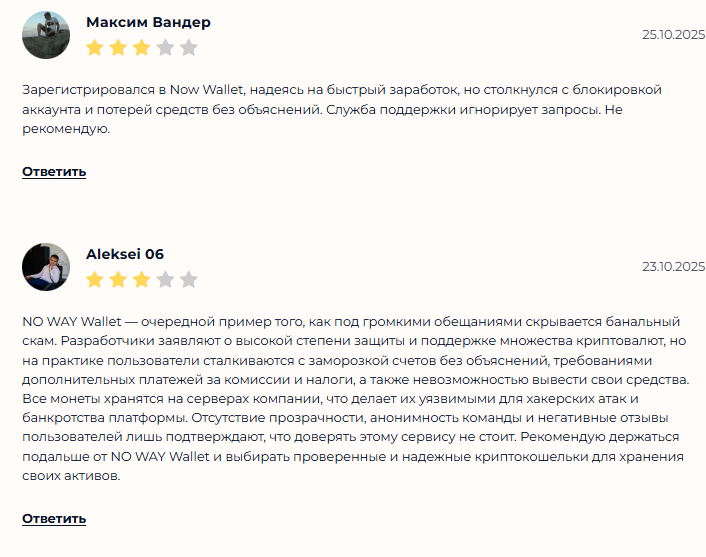 - В сети есть негативные отзывы о Noway Wallet, в которых пользователи рассказывают о блокировках аккаунта и мошенничестве.