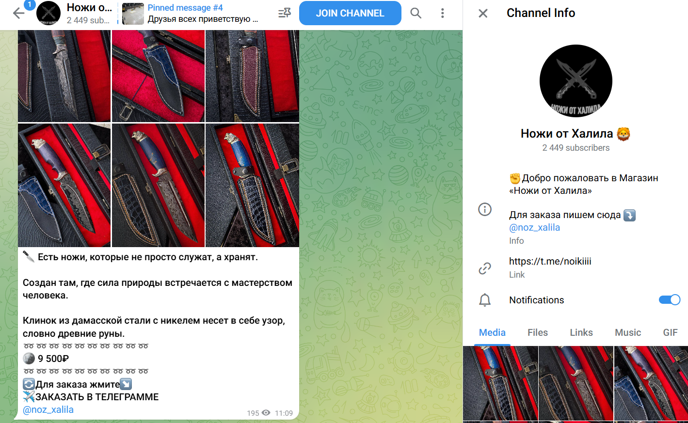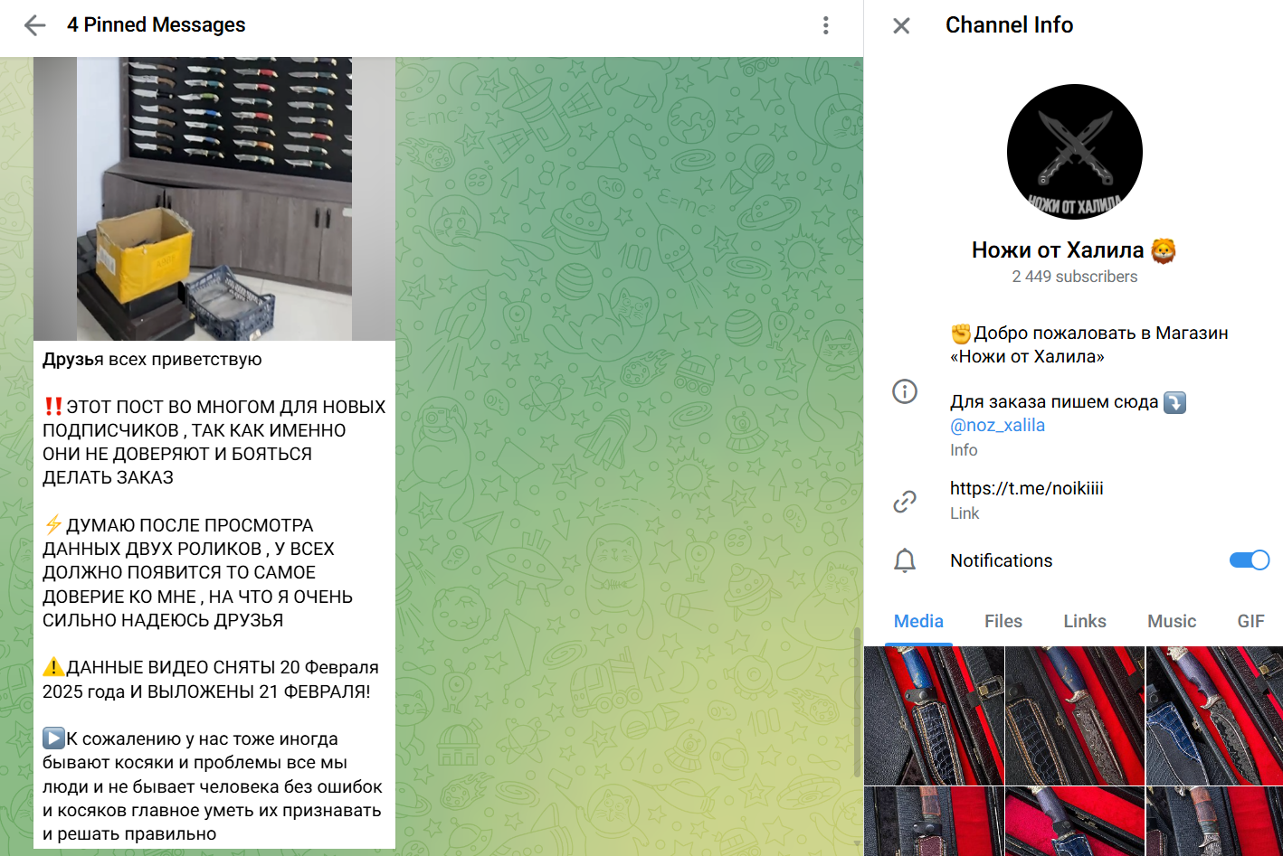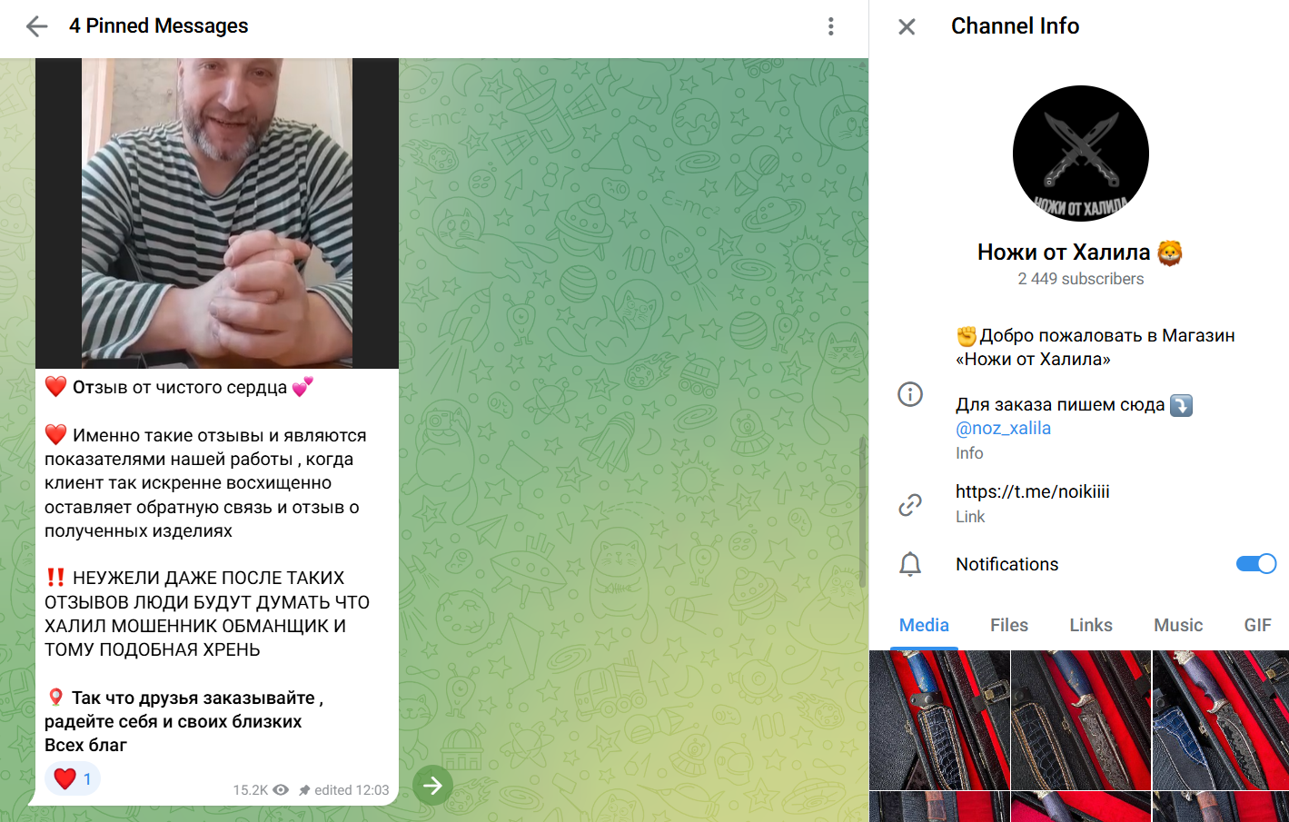 Ножи от Халила — это телеграм магазин, где автор продает ножи якобы ручной работы, а также различные средства для самообороны, включая пневматические или шумовые пистолеты. При этом для связи доступен лишь один анонимный контакт владельца, а в сети о нем нет никакой достоверной информации. Ножи от Халила, развод или нет, узнаете в данной статье.