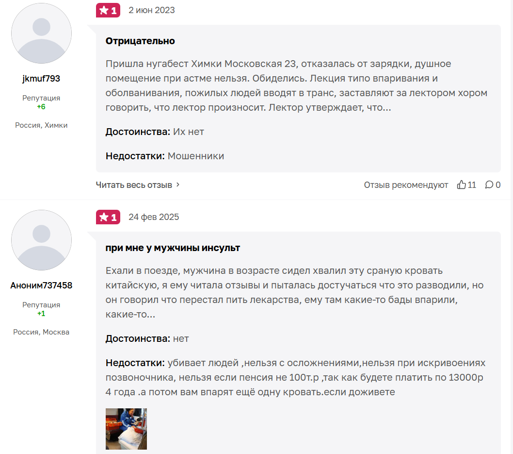 Претензии связаны с тем, что сотрудники компании – неквалифицированные, без медицинского образования. Они убеждают пенсионеров и других уязвимых людей в антинаучной ерунде, заставляя покупать товар, который не стоит своих денег. Также менеджеры могут рекомендовать процедуры, которые нельзя при определенных заболеваниях и могут навредить клиенту.