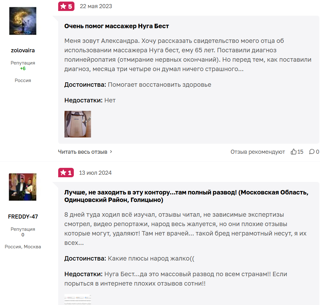 В сети можно встретить редкие положительные отзывы со слезливыми историями, как продукция компании помогала от практически неизлечимых заболеваний, но они очень похожи на рекламные и проплаченные. Большинство реальных отзывов – отрицательные. Люди сходятся на том, что «Нуга бест» – развод.