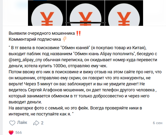 Кроме того, мы нашли в сети комментарий человека, которого чуть не обманул аферист. На самом деле обмена не происходит, получив перевод, Сергей исчезает и блокирует пользователя. Чтобы подтвердить свою надежность, он пользуется репутацией другого человека, который проводит операции с юанями официально.