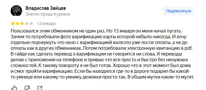 Другие жалуются на то, что обменник требует фото верификации карты после оплаты или квитанцию, хотя в гайде об этом ничего не сказано. Некоторые опасаются потерять деньги и сомневаются в безопасности обменника.