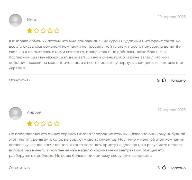 Кроме того, есть и отзывы, где клиенты так и не дождались обмена и по их словам Obmen77 присвоил их деньги себе.