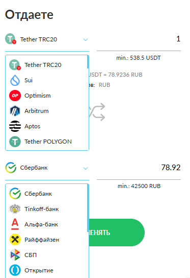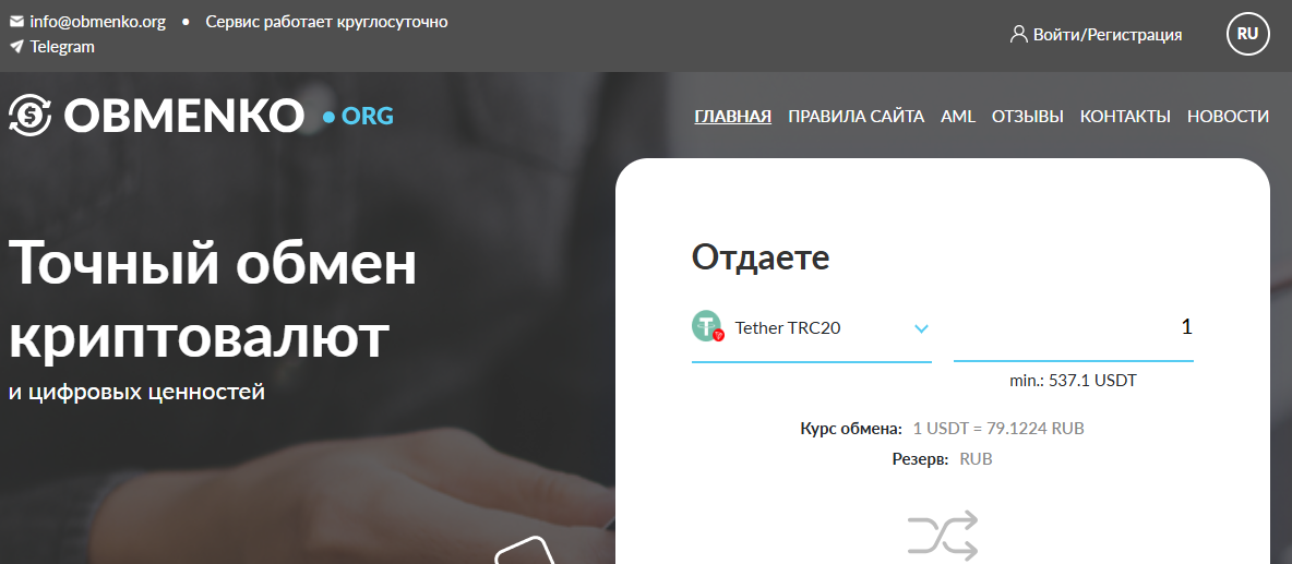 Вдобавок сервис предлагает конвертацию цифровых активов в наличные доллары США. Компания обещает лучший курс. Между тем обмен TRC20 → Сбербанк RUB возможен был 2 сентября 2025-го по курсу 1:78,92. В то время как не менее 40 обменников на BestChange предлагали больше, максимально 1:81,684. То есть экономия при обмене 1000 монет USDT TRC20 составит более 2 тысяч рублей, если вы воспользуетесь услугами конкурентов Обменко.