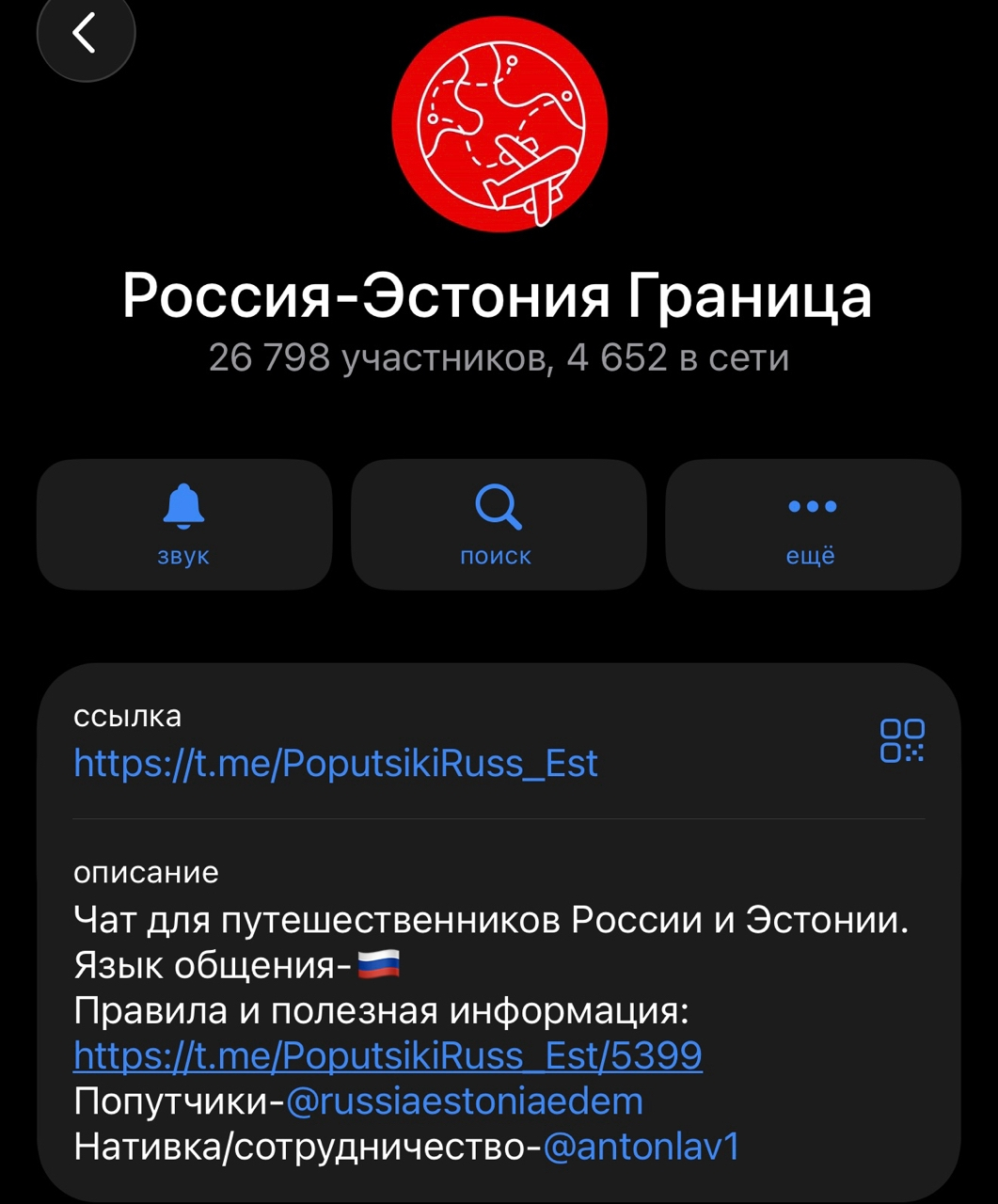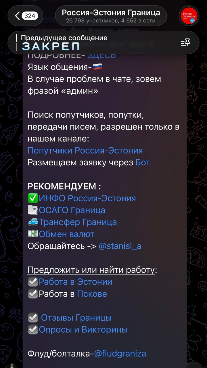 Но главной гарантией является размещение в закрепленных сообщения в русскоязычной группе «Россия-Эстония Граница», на которую подписано без малого 27 000 пользователей.Канал создан для иммигрантов и путешественников, в чате ведется активное общение пользователей и обмен полезной информацией.