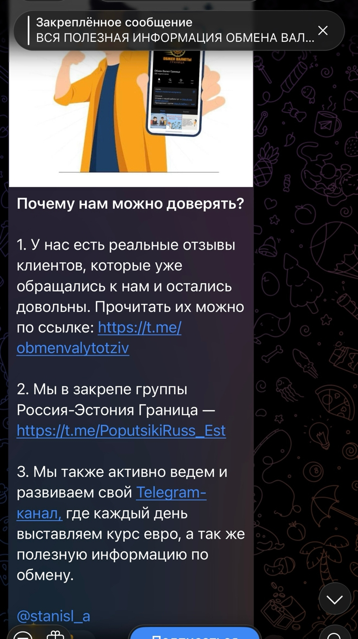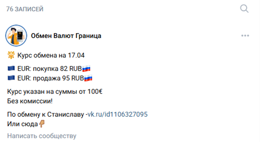 В группе есть закрепленный пост с полезными сервисами и «Обмен Валют Граница» входит в этот список. Но важно понимать, что владельцы обменного сервиса сохраняют анонимность и никаких официальных гарантий прозрачности сотрудничества нет.