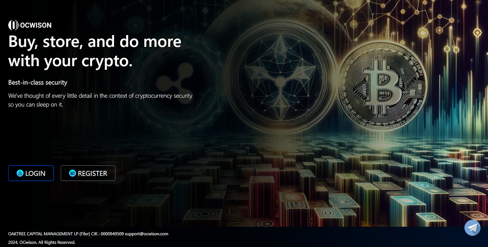Все взаимодействие с криптокошельком происходит через официальный сайт ocwison com, который по сути представляет собой несложно сделанный одностраничник. Здесь пользователям максимально кратко рассказывают, что может делать сервис, а затем обещают лучшую защиту криптовалютных активов. Внизу есть электронная почта платформы. Активными же являются лишь две кнопки: входа и регистрации. Возможно, большая информация предлагается уже после авторизации, однако честные проекты не поступают таким образом.