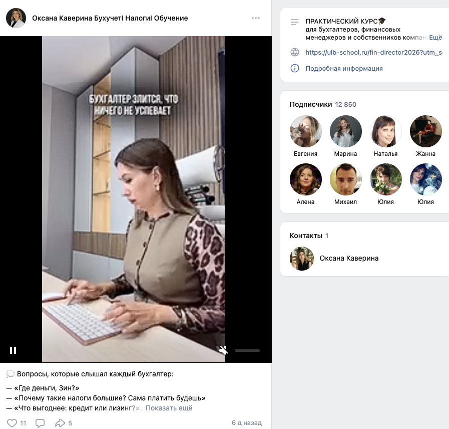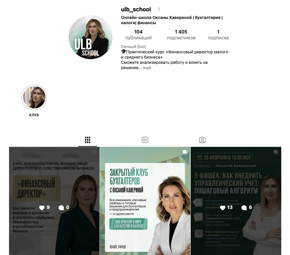 На страницу «Оксана Каверина Бухучет Налоги Обучение», которая располагается по адресу upb nalogi, подписаны 12,85 тысяч пользователей. Контент в ее ленте примерно такой же, как и в ТГК. Посты собирают по 5-15 лайков.