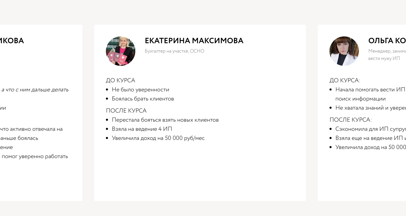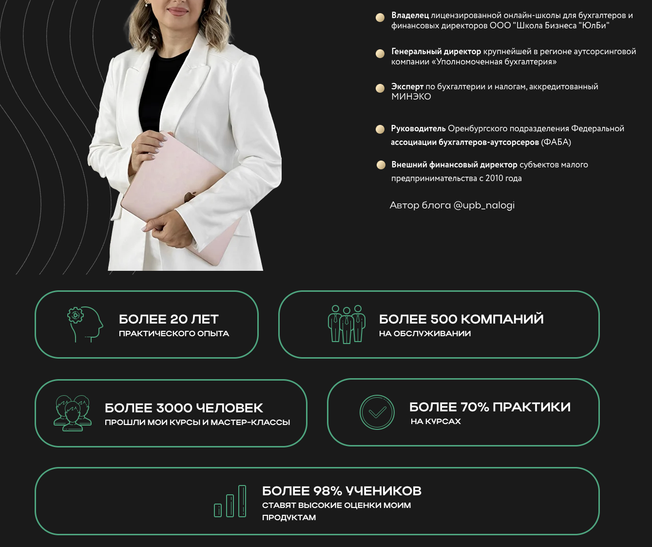 Оксана Каверина — бухгалтер с двадцатилетним опытом. Ведет медийные ресурсы с большим количеством подписчиков. Их аудитории она предлагает курсы, которые связаны с бухгалтерией, налоговым учетом и т.п.