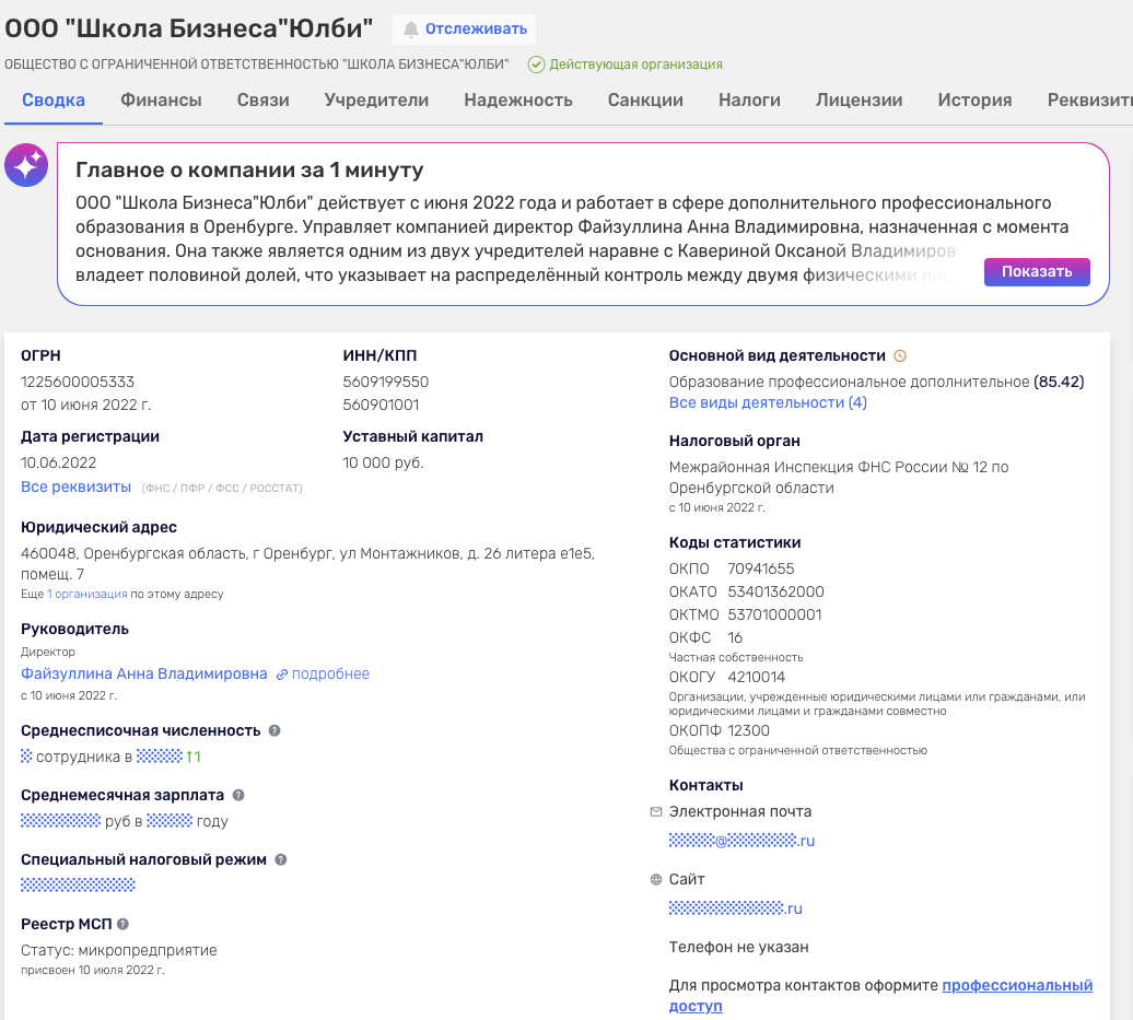 Бухгалтер ведет образовательную деятельность от лица ООО «Школа Бизнеса Юлби». Она была основана в июне 2022-го года, а ее уставный капитал составляет 10 тысяч рублей.