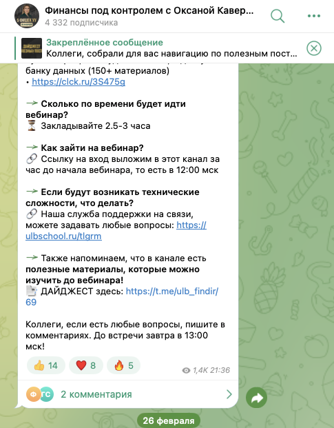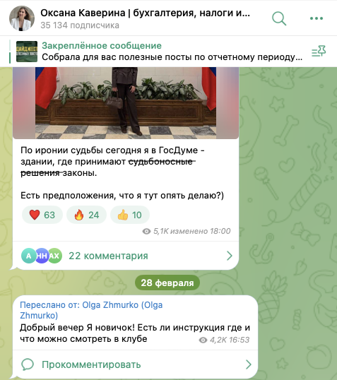 На телеграмм-канал «Оксана Каверина бухгалтерия налоги и финансы», располагающийся по адресу upb nalogi, на 4 марта 2026-го года, подписаны 35 тысяч пользователей. Активность на ТГК высокая. Посты на канале собирают по 4-5 тысяч показов. Некоторые публикации получают еще и по 40-80 реакций, а также несколько десятков комментариев.