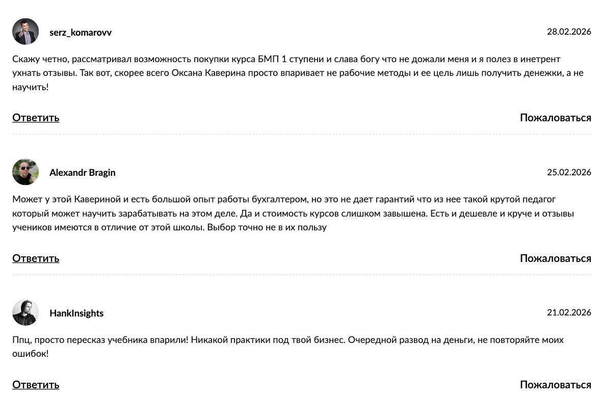 На неподконтрольных Оксане ресурсах фидбэк о ней довольно скромный. Причем, преобладают именно негативные ревью. Авторы некоторых отзывов заявляют, что Каверина на своих курсах просто пересказывает информацию из учебников по бухгалтерии.