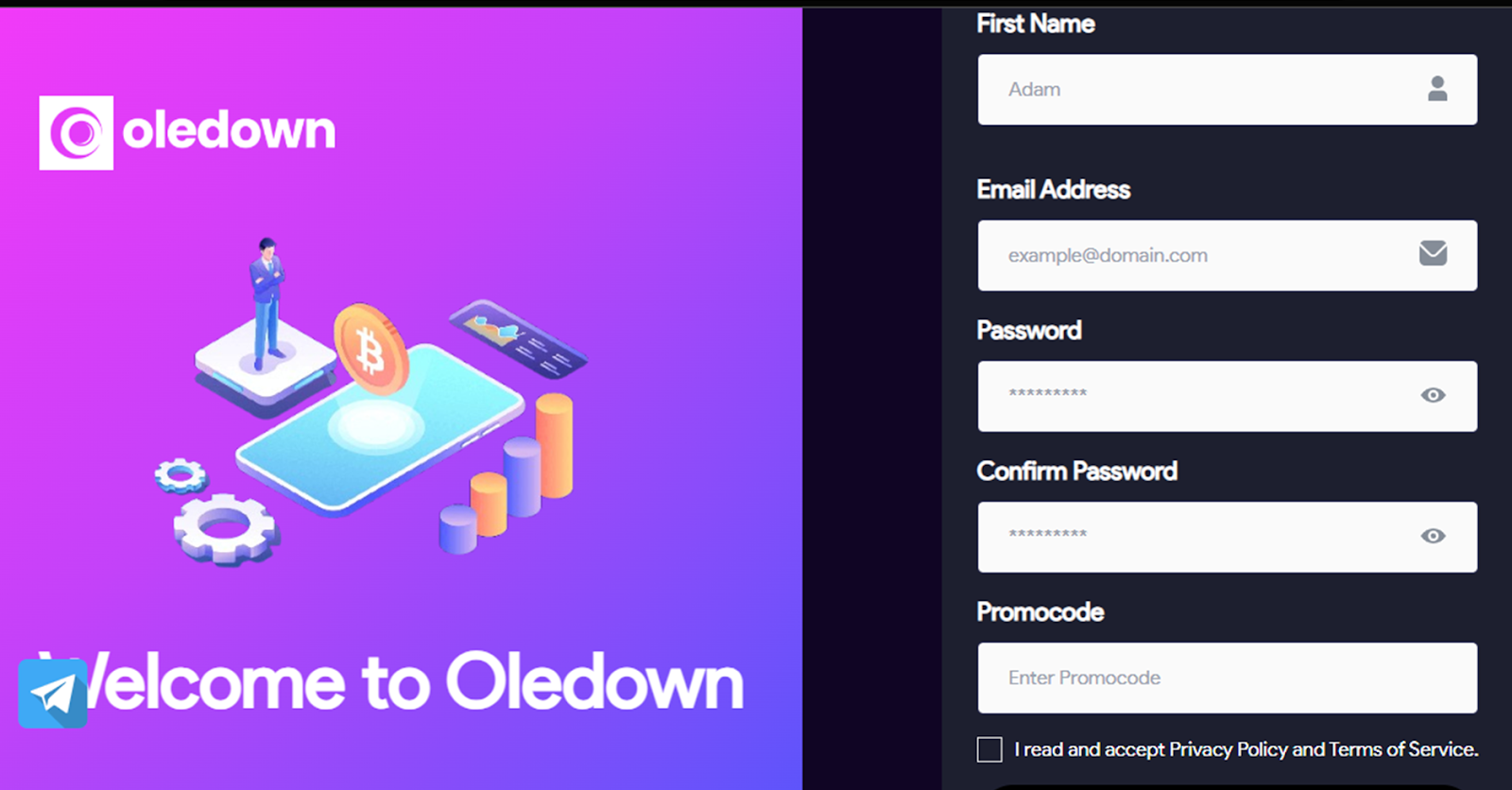 К тому же, адрес электронки техподдержки Support oledown com, оказался недействительным. Актуален лишь чат поддержки в Телеграме, на который дается ссылка при регистрации.