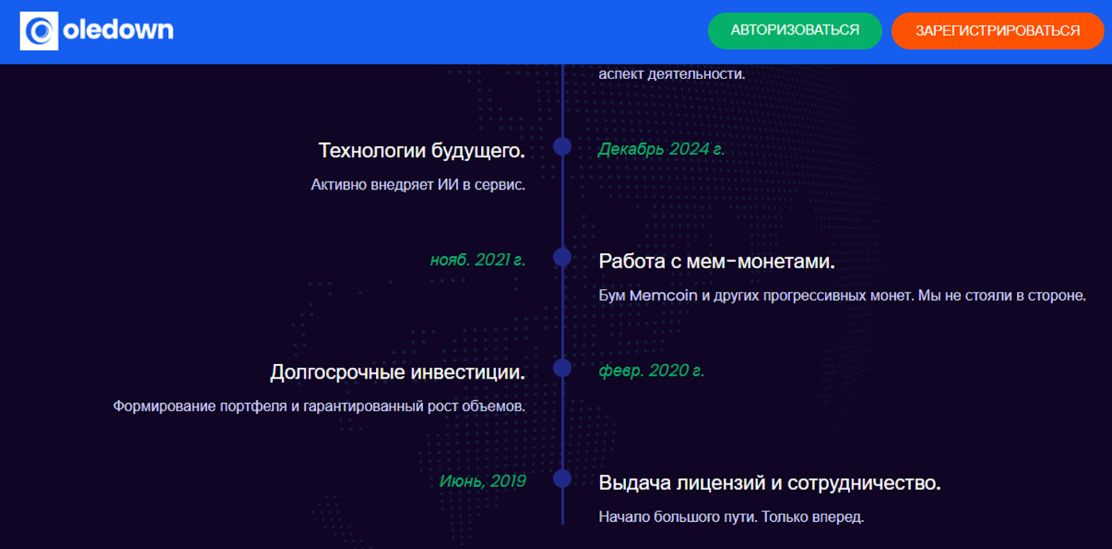 Сайт Oledown com англоязычный. Проект подчиняется европейской комиссии SEC, но данных о лицензии и разработчиках нет. Если верить дорожной карте, проект был запущен в 2019 году.