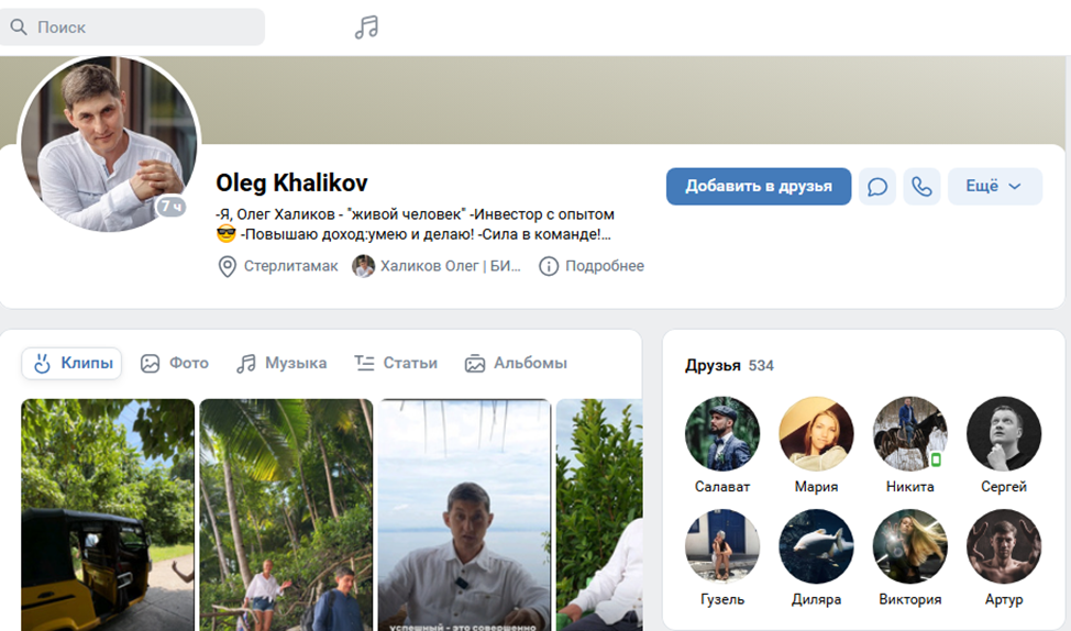 Основная информационная деятельность приходится на VK . Группа “Халиков Олег | БИЗНЕС — Психология” собрала всего 840 подписчиков, а последняя активность датируется 2022 годом. Здесь представлена реклама курсов и инвестиционных проектов, вроде Sincere Systems и Vsemprosto. Некоторые обучающие программы написаны в коллаборации с бизнес-коучем Al Teta A. Вероятно, группа заброшена из-за потока негативных отзывов о проекте “Олег Халиков. Инвестор 💰”