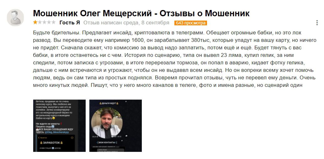 В интернете пользователи пишут, что Олег Мещерский – не настоящее имя трейдера. Он уже несколько раз менял каналы и называл себя другими именами. В интернете огромное количество отрицательных отзывов от реальных людей о заработке на криптовалютах в Телеграм-каналах Олега Мещерского