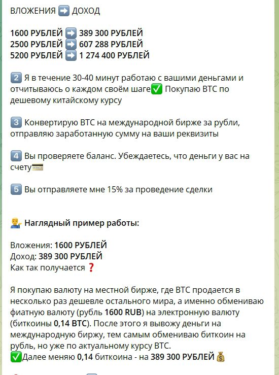 Минимальная сумма вложений составляет 1 500 рублей. Автор канала обещает 350% прибыли уже через несколько часов. Минимально заработать можно за 40 минут, если сумма вложений заинтересует лично трейдера Олега Мещерского. Он объясняет такой заработок тем, что китайским гражданам якобы запретили торговать на криптовалютных платформах, и они избавляются от цифровых денег буквально за бесценок.