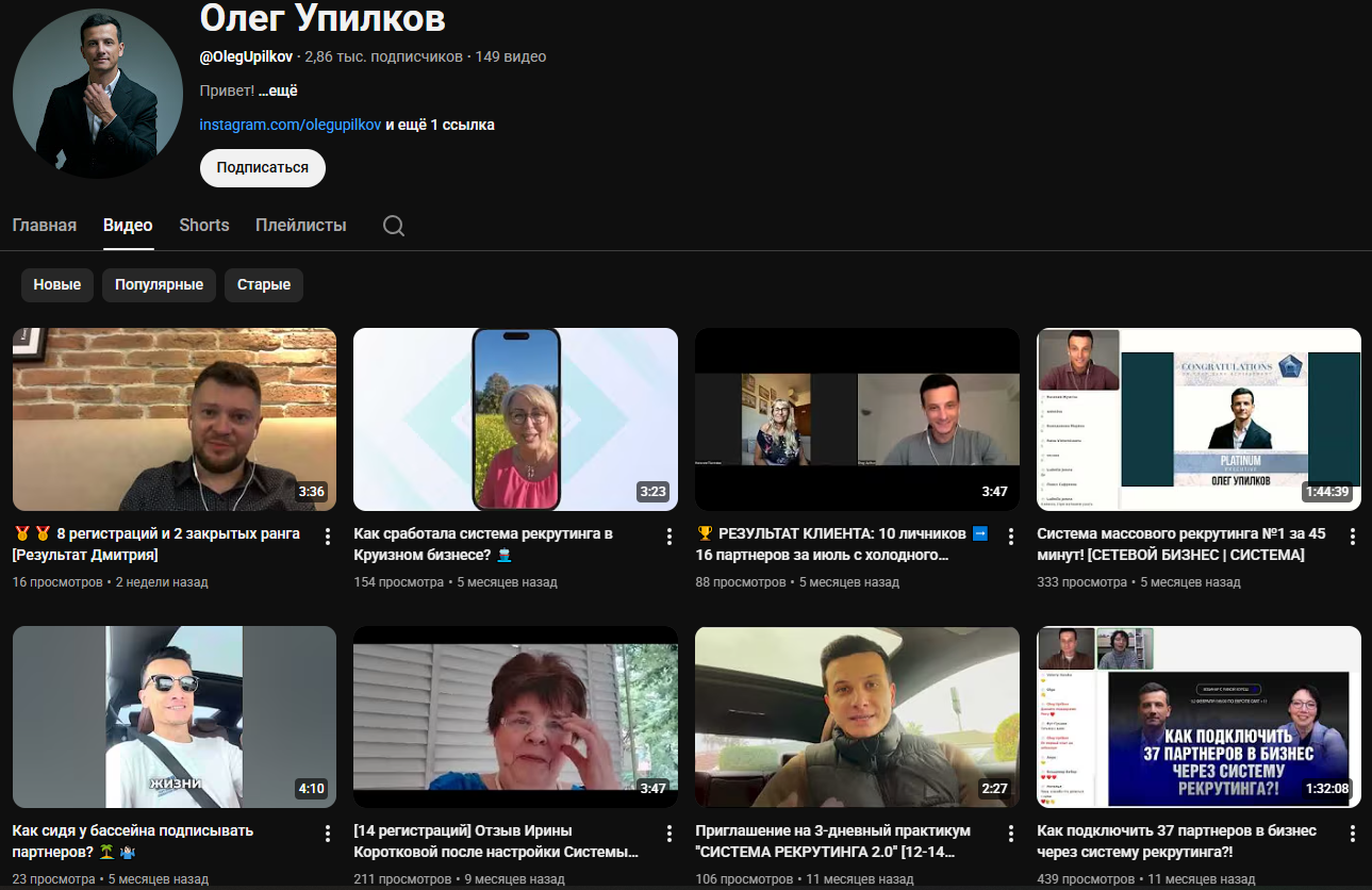 Признаков развода в работе Олега Упилкова нет. Он действительно давно работает в сетевом маркетинге, много лет ведет об этом канал на Ютубе. Судя по контенту, разбирается в теме.При этом неизвестно, насколько он успешен в своем деле. На его сайтах или в соцсетях нет информации о его кейсах, собранных командах или компаниях, на которые он работал.